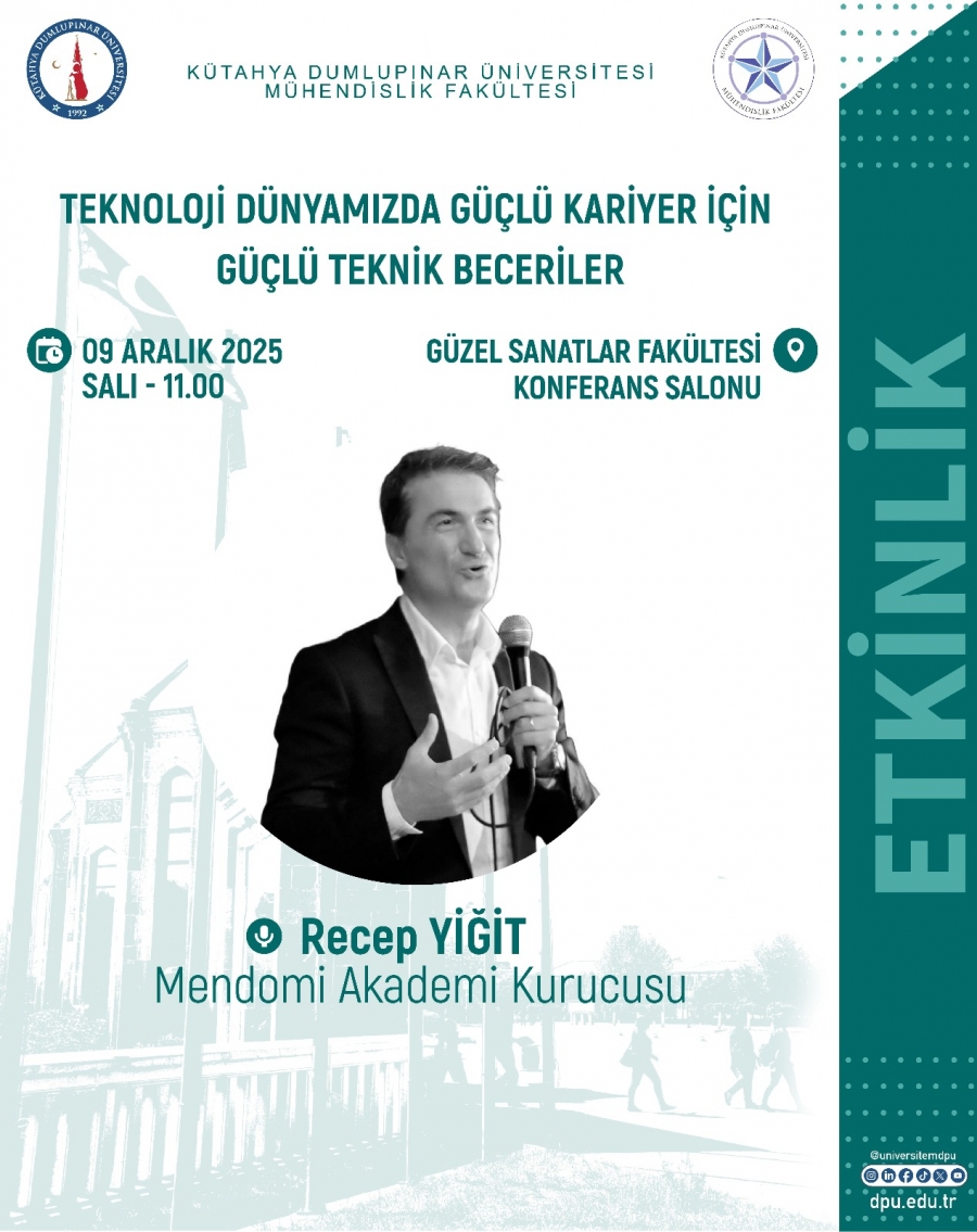 Mendomi Akademi Kurucusu Recep Yiğit’in konuşmacı olarak katılacağı; Yalın üretim, 5S ve Kaizen konularının da dahil olduğu Teknoloji Dünyamızda Güçlü Kariyer İçin Güçlü Teknik Beceriler başlıklı etkinlik, 9 Aralık 2025 Salı günü saat 11.00'de Güzel Sanatlar Fakültesi Ahmet Yakupoğlu Konferans Salonu'nda gerçekleştirilecektir.